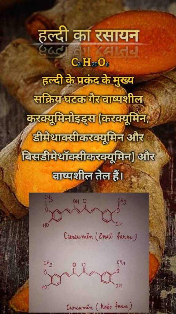 हल्दी के प्रकंद के मुख्य सक्रिय घटक गैर वाष्पशील करक्यूमिनोइड्स (करक्यूमिन, डीमेथाक्सीकरक्यूमिन और बिसडीमेथॉक्सीकरक्यूमिन) और वाष्पशील तेल हैं।